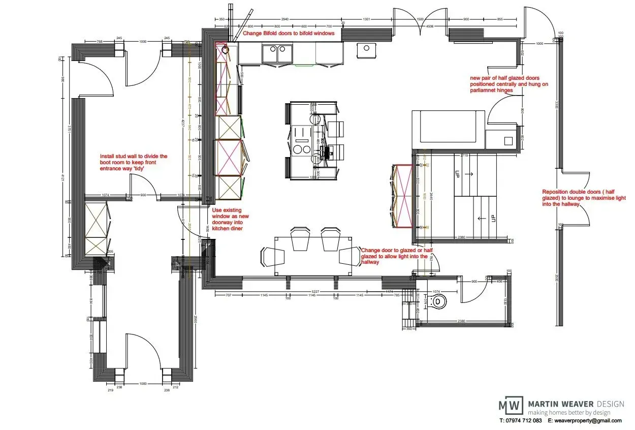 - Rethinking bifolds: I’d replace the north-facing bifold doors with a bifold window. This still allows for a good connection to the patio — ideal for passing out food and chatting with guests — while keeping the flexibility to open it fully for ventilation. You already have French doors elsewhere for direct garden access.